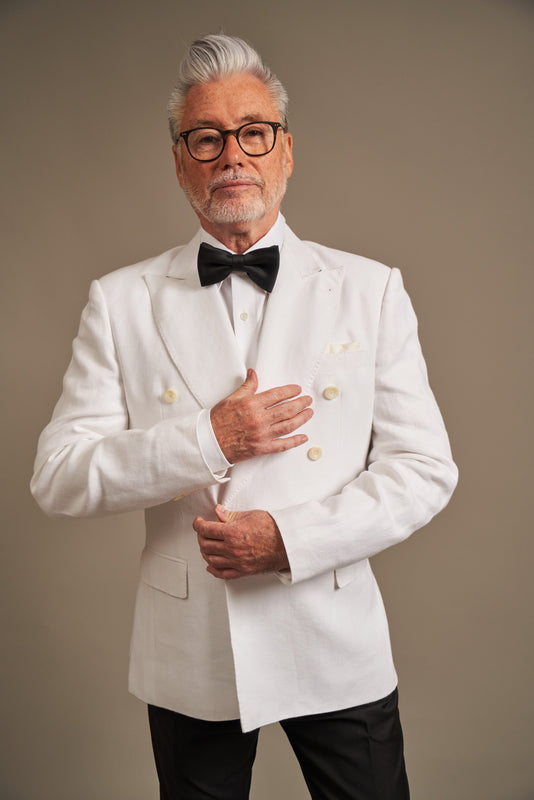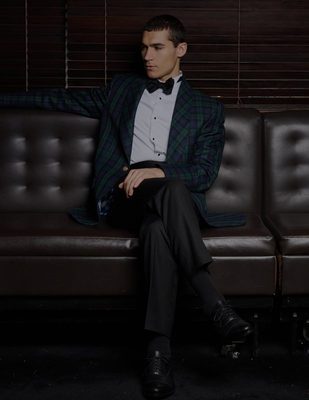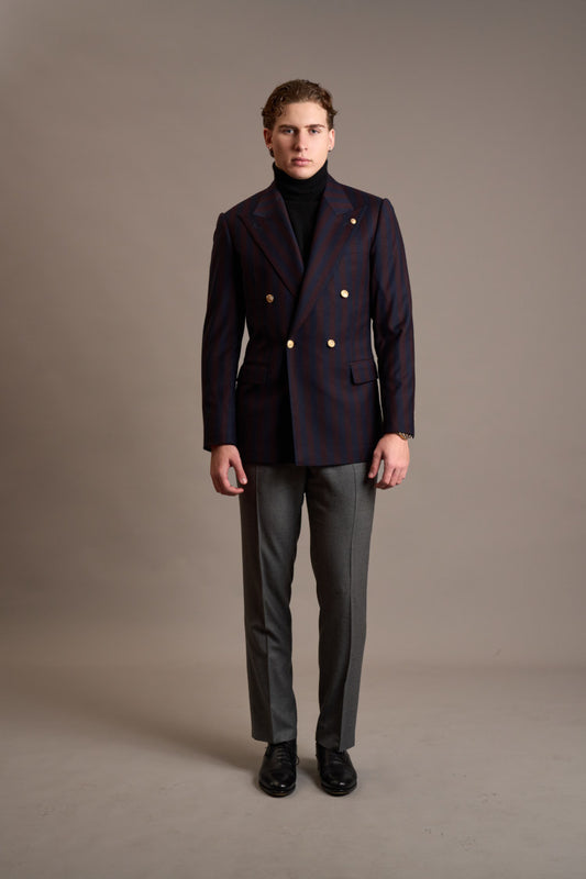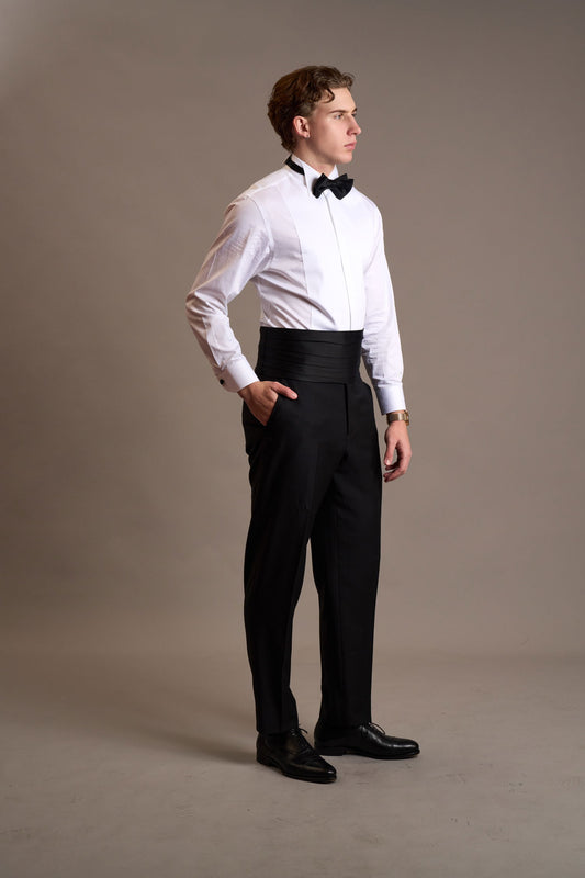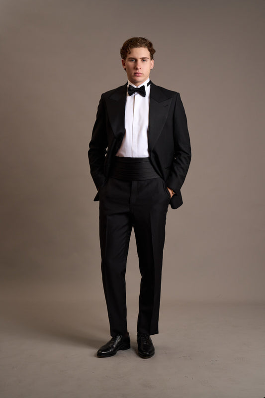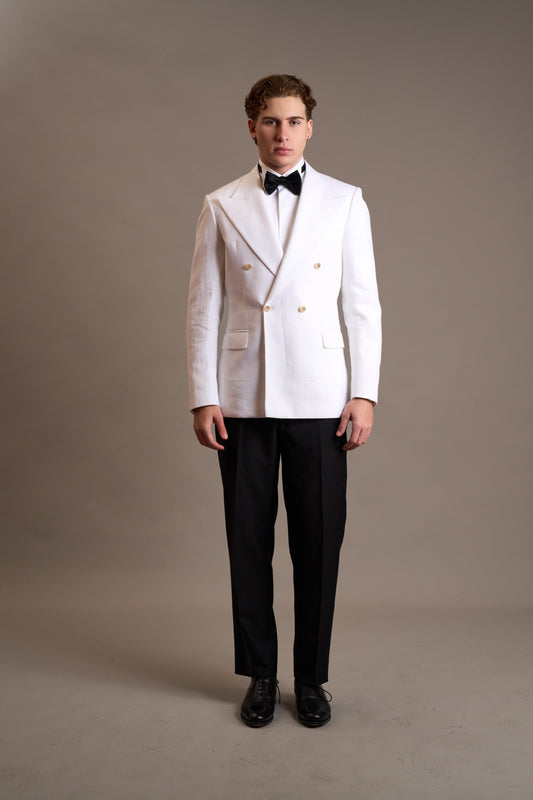 Jacket options include your choice of internal lining, lapel style (peak, notch, or shawl), single or double-breasted fronts, buttons and more. We also offer refined details such as monogramming and other personalised touches. Please book a consultation with us to discuss your ideas.